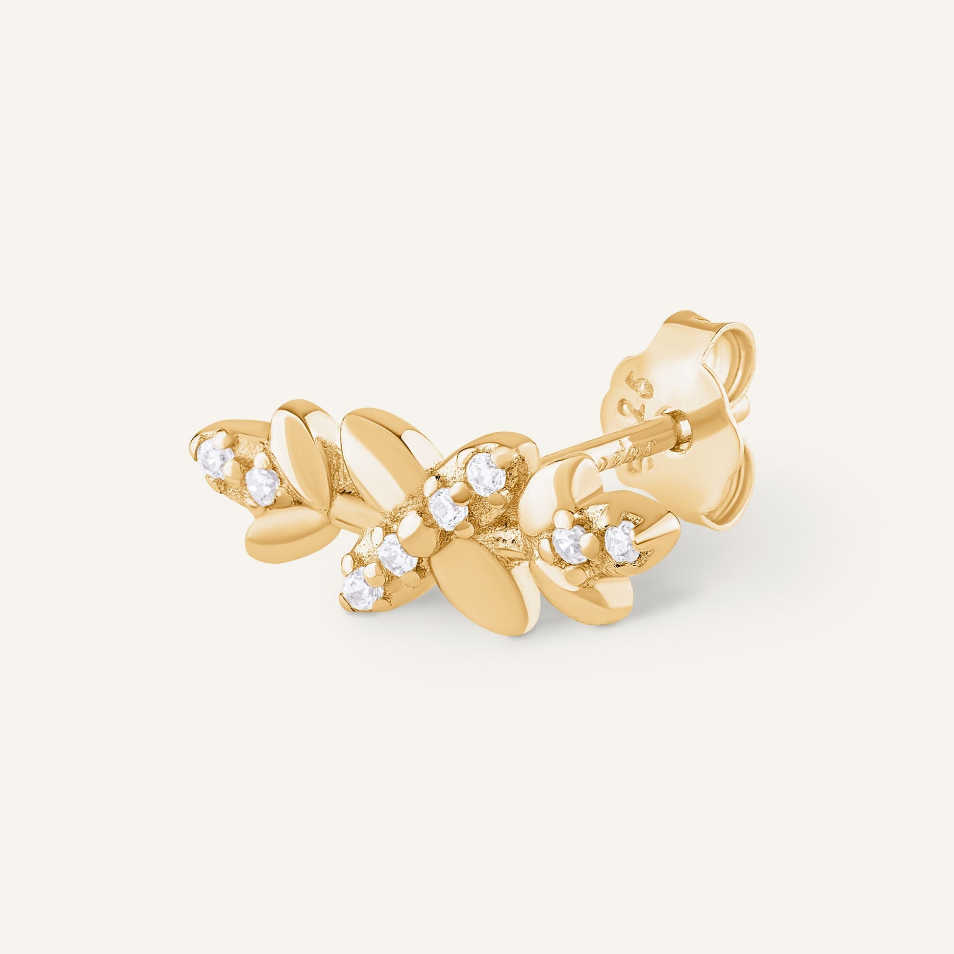 Boucle puce en argent 925 doré à l'Or fin 24 carats, dessinée en arc et sertie de pierres de zirconium qui captent la lumière avec élégance.