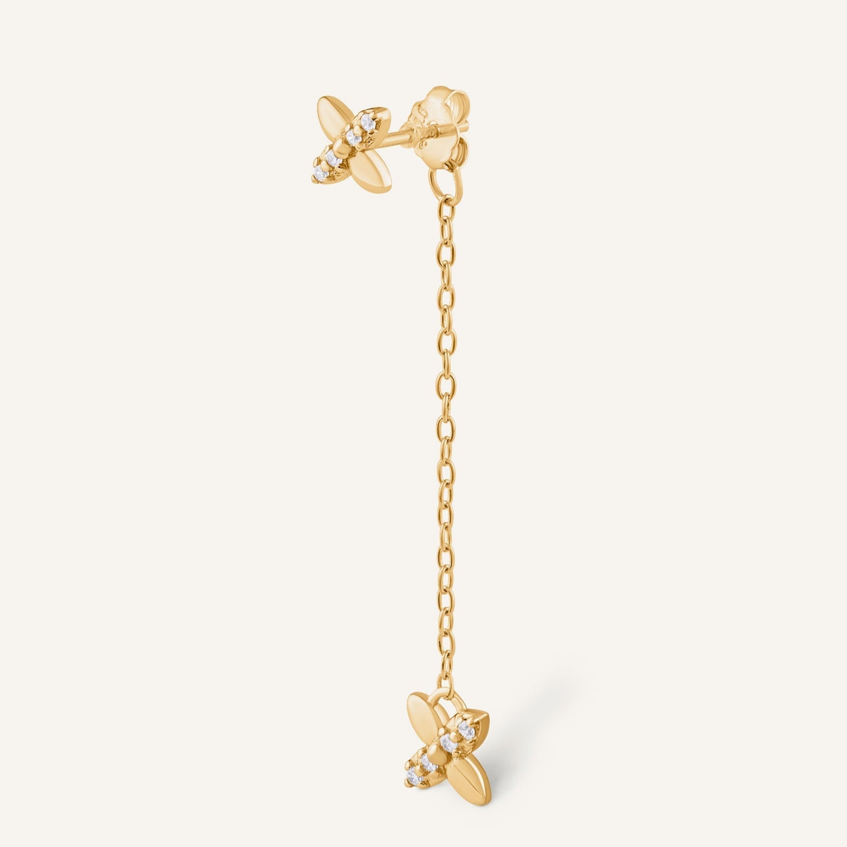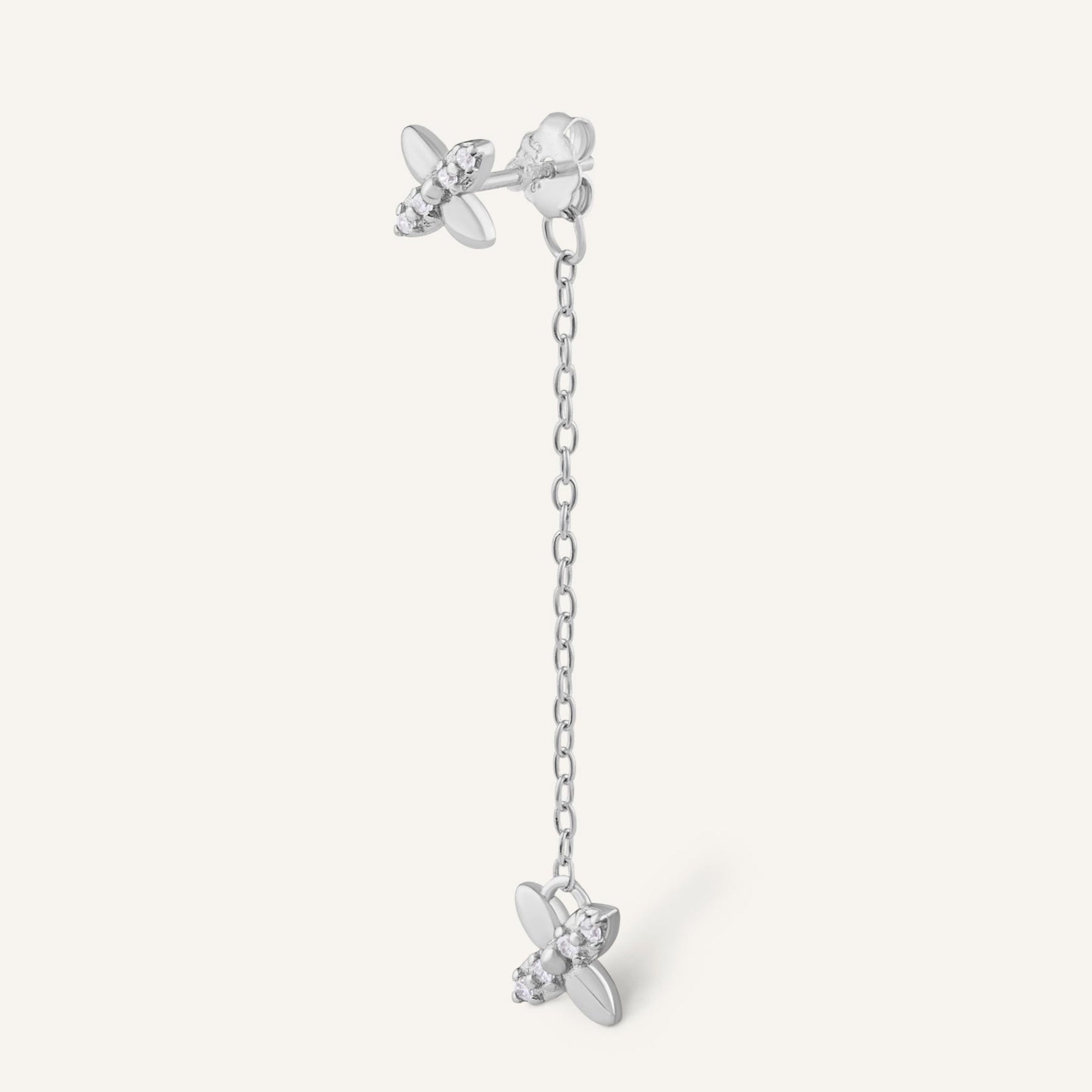 Boucle d'oreille en argent 925 doré à l'Or fin 24 carats reliée à une fine chaîne et sublimée de zirconium pour un éclat subtil.